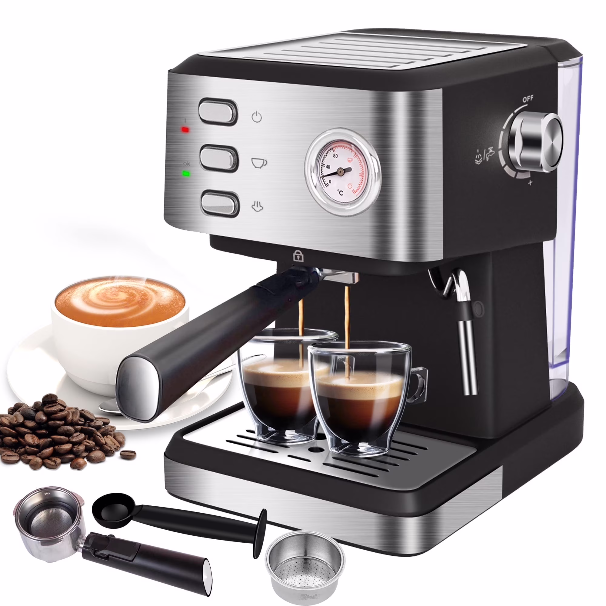 Bluebow Espresso Machine 20 Bar, 1.5L Water Tank Pressure Gauge Milk Frother Steam Coffee Maker, Silver