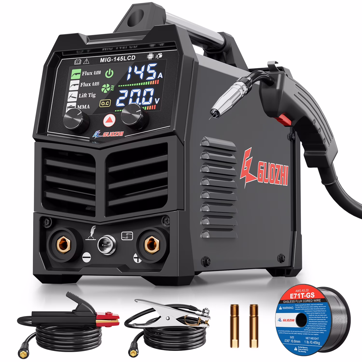 GZ GUOZHI 145A MIG Welder with Large LCD Display, 3 in 1 MIG/Stick/LIFT TIG Welder Machine, 110V Flux Core Welder for Beginners