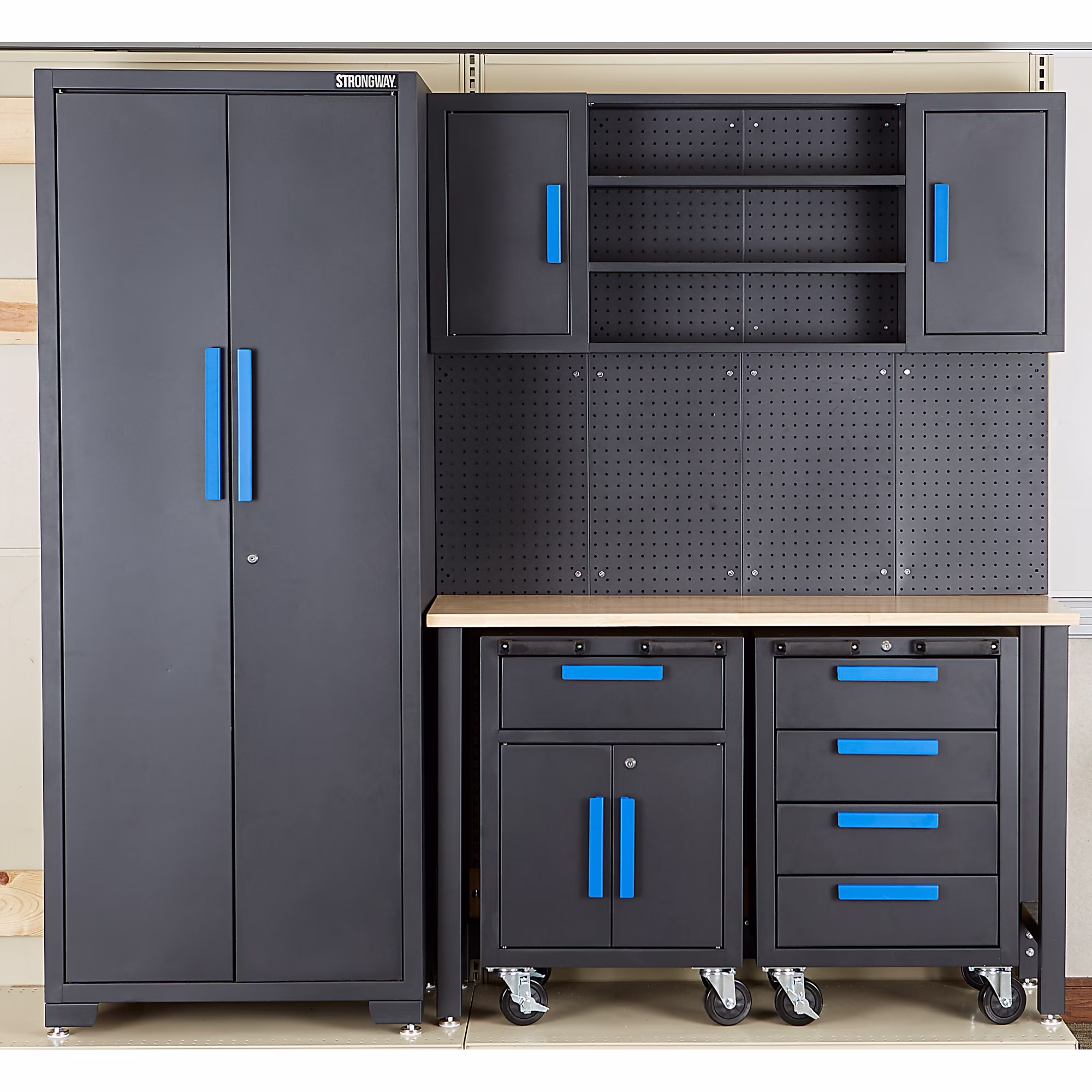 Strongway 6-Pc. Steel Garage Storage System with Drawers, Pegboard, Shelves, Tabletop, 2 Rolling Cabinets, 81.5in. x 75.7in.