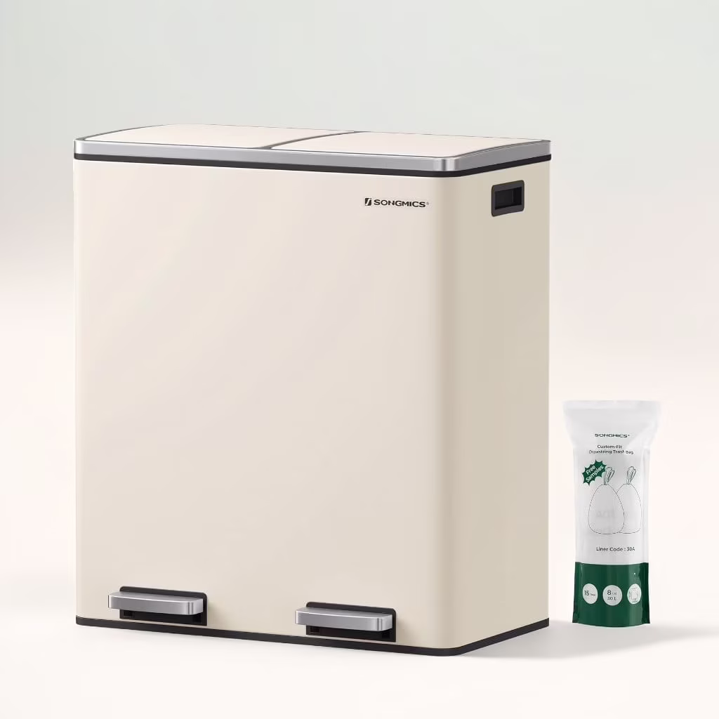 16 Gallon Dual Trash Can, Rubbish Bin and 15 Trash Bags, Metal, Almond Color
