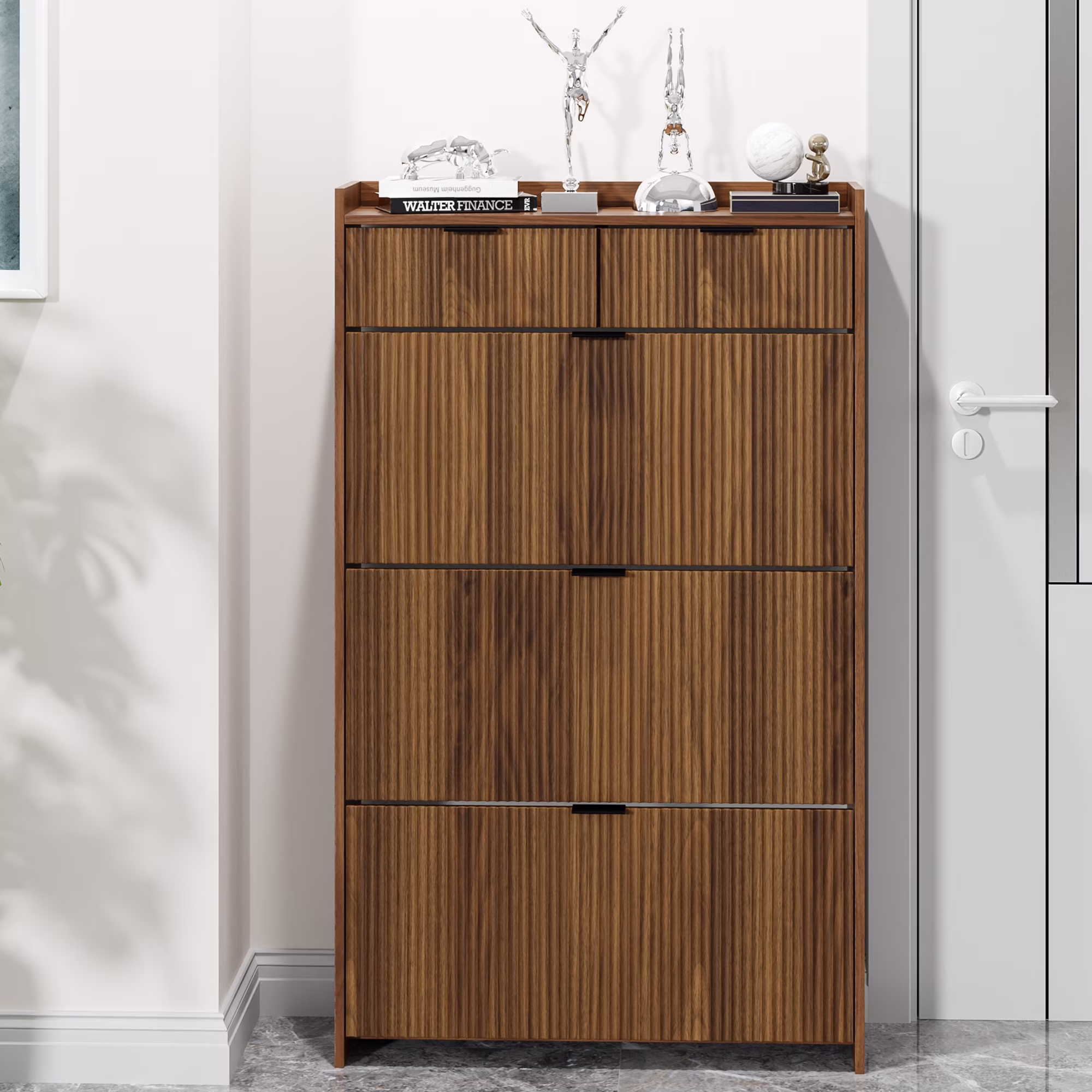 Shoe Cabinet, Free Standing Tipping Bucket Shoe Rack Organizer with 3 Flip Drawers, Modern Entryway Narrow Shoe Rack with 2 Drawers & Top Storage, for Hallway Bedroom, Walnut