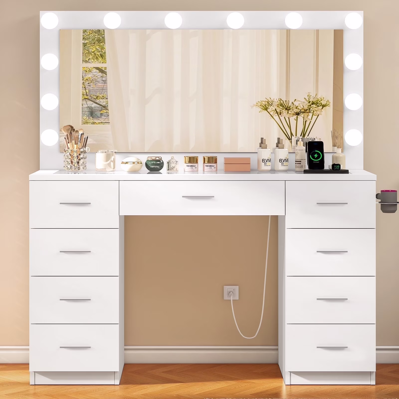 White Vanity Desk with Illuminated Mirror & Power Outlet, 11 Drawers Vanity Table with Chair, Makeup Vanity with 12 LED Lights, Tempered Glass Top, Dressing Table for Bedroom,Dressing Room