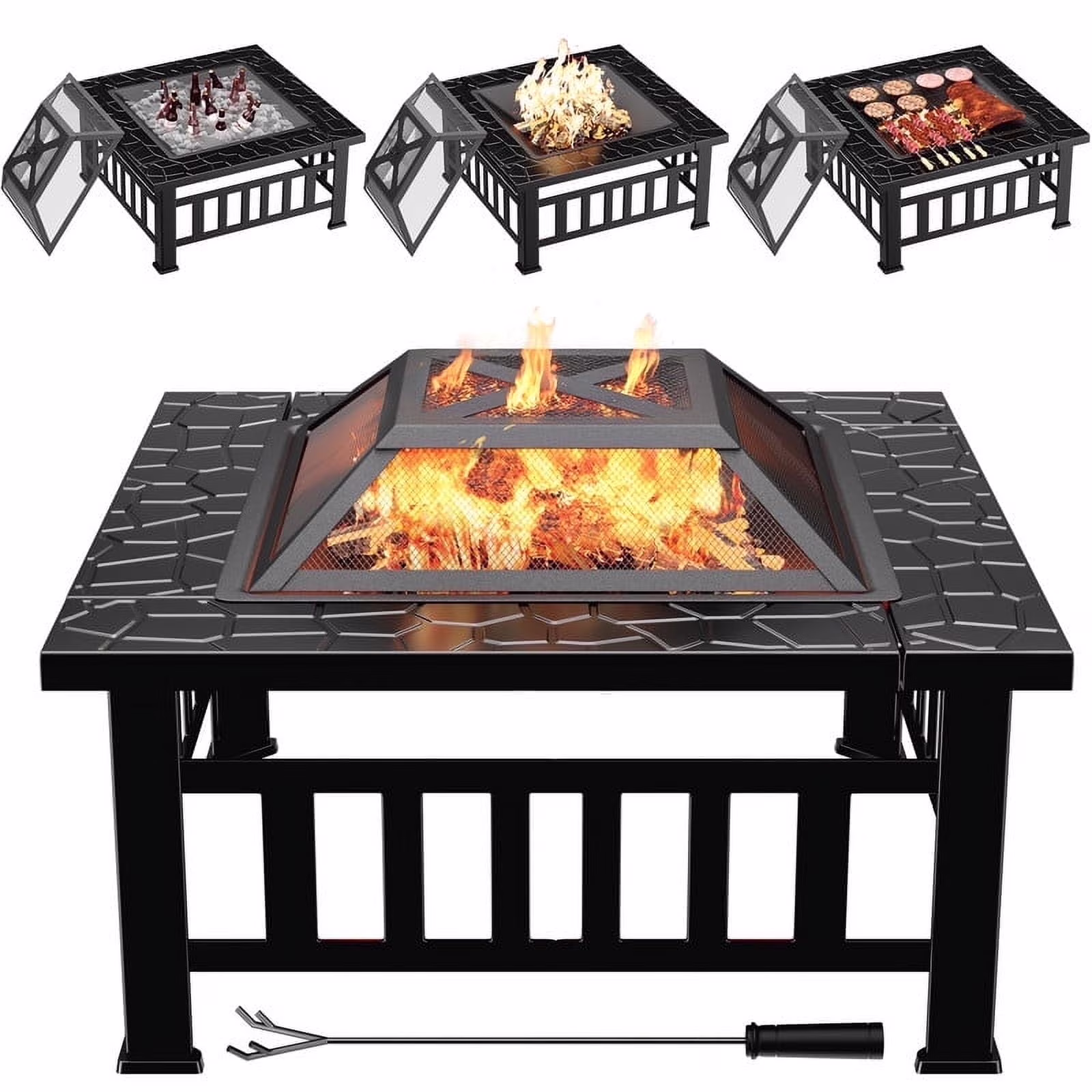 Devoko Outdoor 32" Square Metal Fire Pit with Cover and Poker, Black