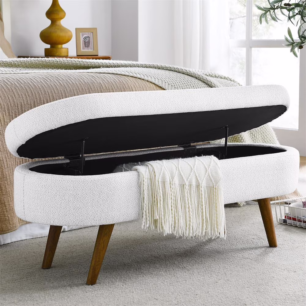 Sumdeal 43.5" Storage Ottoman Bench with 250lb Seating, Linen Upholstered Wood Legs Safety Hinge Flip Top Oval Foot Rest Long Stool for Sofa Couch Bedroom End of Bed Living Room Entryway, White