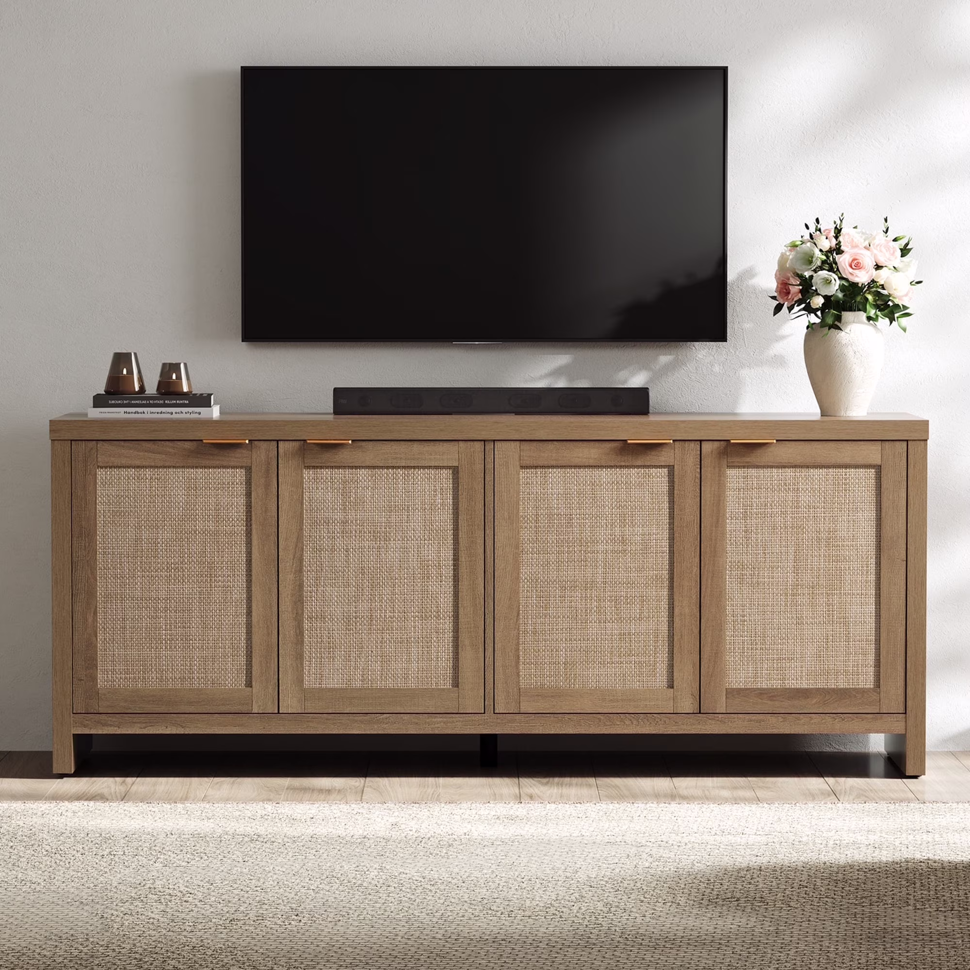 SICOTAS 61.5"W Rattan TV Stand with 4 Doors, Boho Entertainment Center with Adjustable Shelves & Spacious Countertop �C Large Boho Farmhouse Media Console for Living Room, Reclaimed Caramel Oak