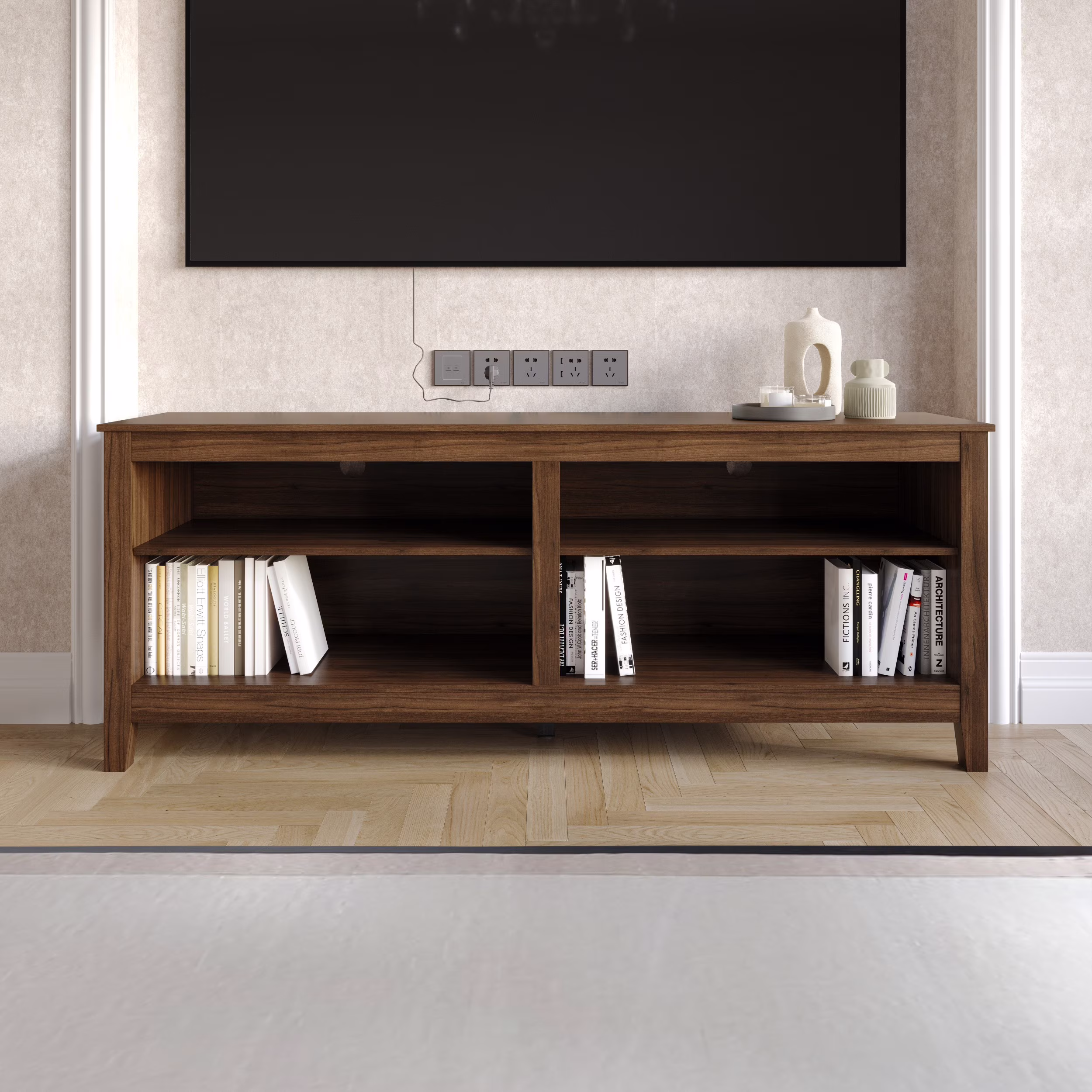 Home Design Kittery TV Stand with Open Shelves and Cable Management, Sturdy Legs, Modern Design for Living Room, Brown Finish
