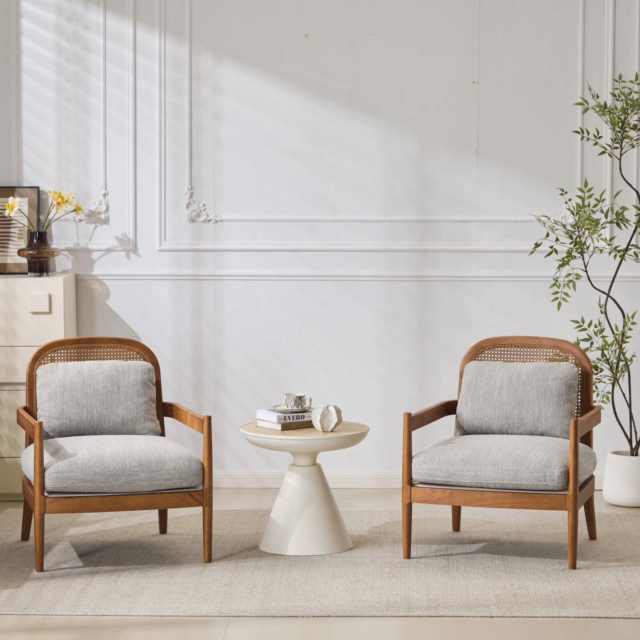 Christopher Knight Home Mid-Century Modern Accent Chairs, Wood Frame with Rattan Backrest, Grayish Green, Set of 2