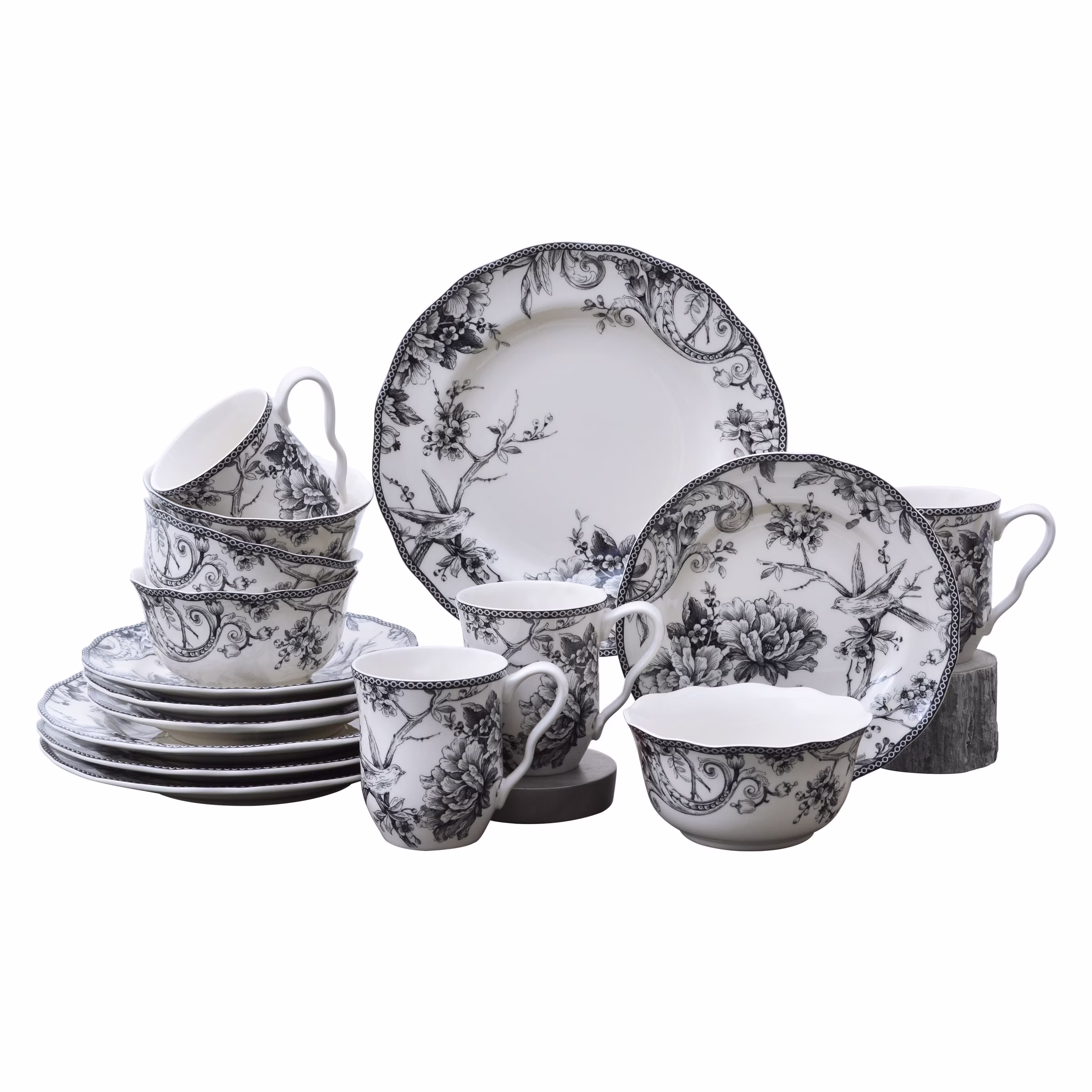 222 Fifth Adelaide Round 16-Piece Porcelain Dinnerware Set, Black Toile