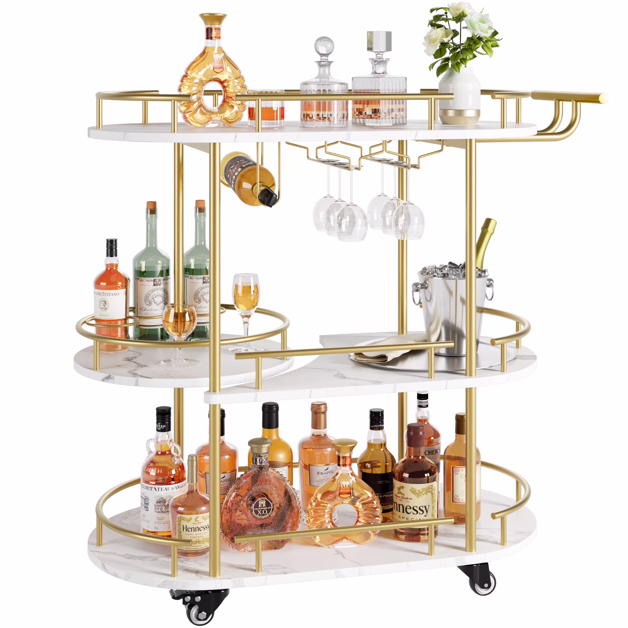 Garvee Bar Serving Cart, 3-Tier Storage Shelves & Wine Rack and Glass Holder, Golden & White