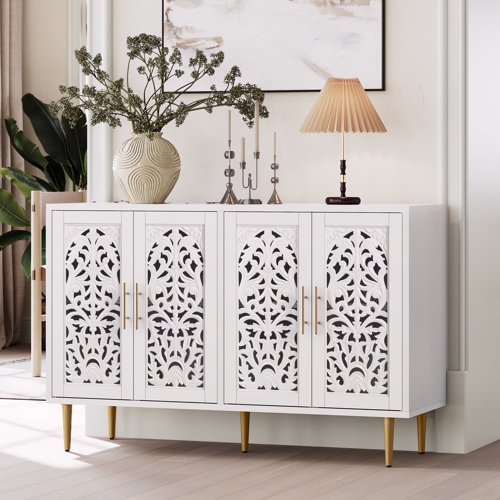 HLR 48" Accent Cabinet with 4 Doors, Vintage Hollow Carving Storage Credenza, Sideboards and Buffets Cabinet for Living Room, Kitchen, Dining Room, Entryway