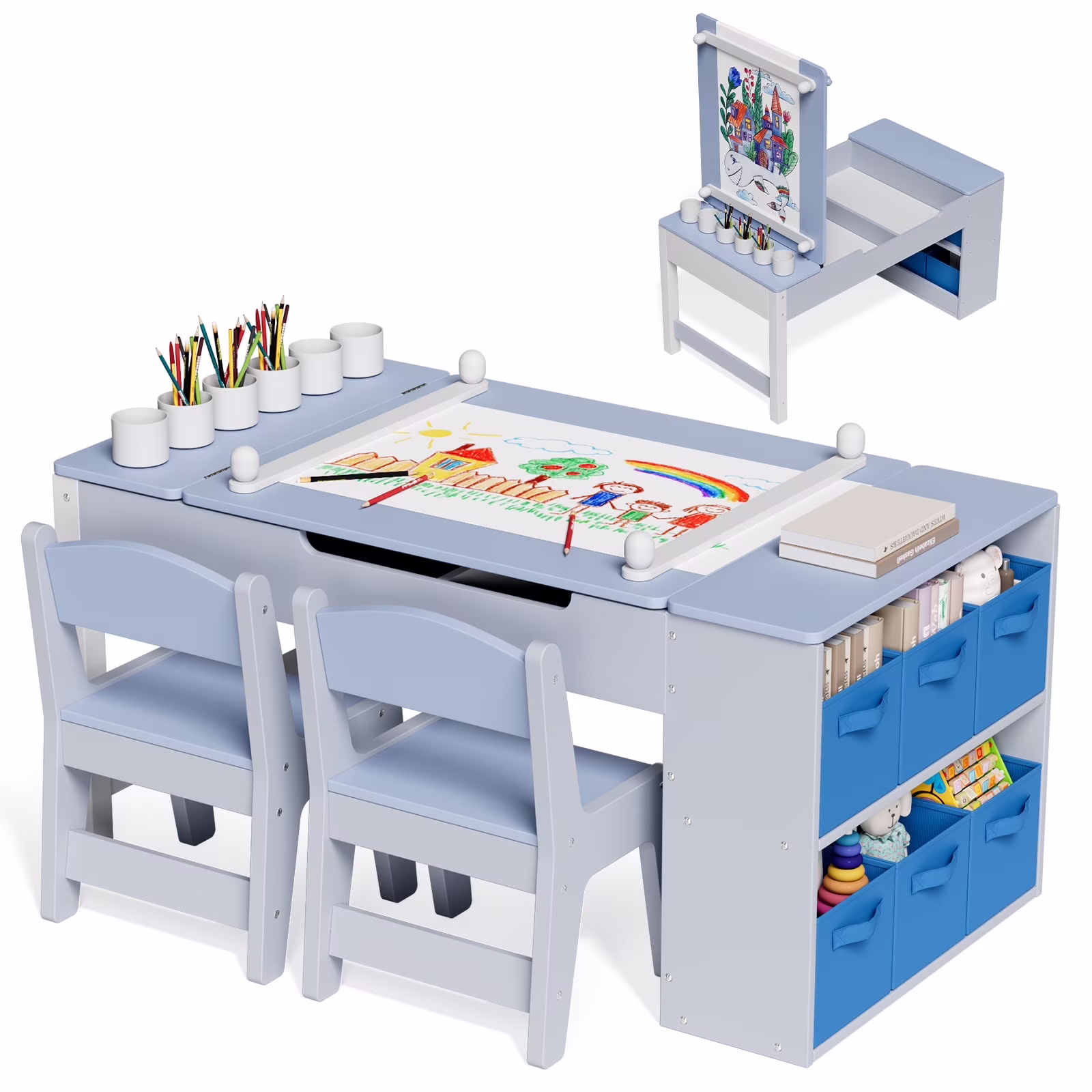 LAZY BUDDY Kids Art Table and 2 Chairs Set, 2 in 1 Easel & Toddler Craft Table and Chairs Set with Storage Bins, Paint Cups and Paper Roll, Activity Table Set for Children 3+