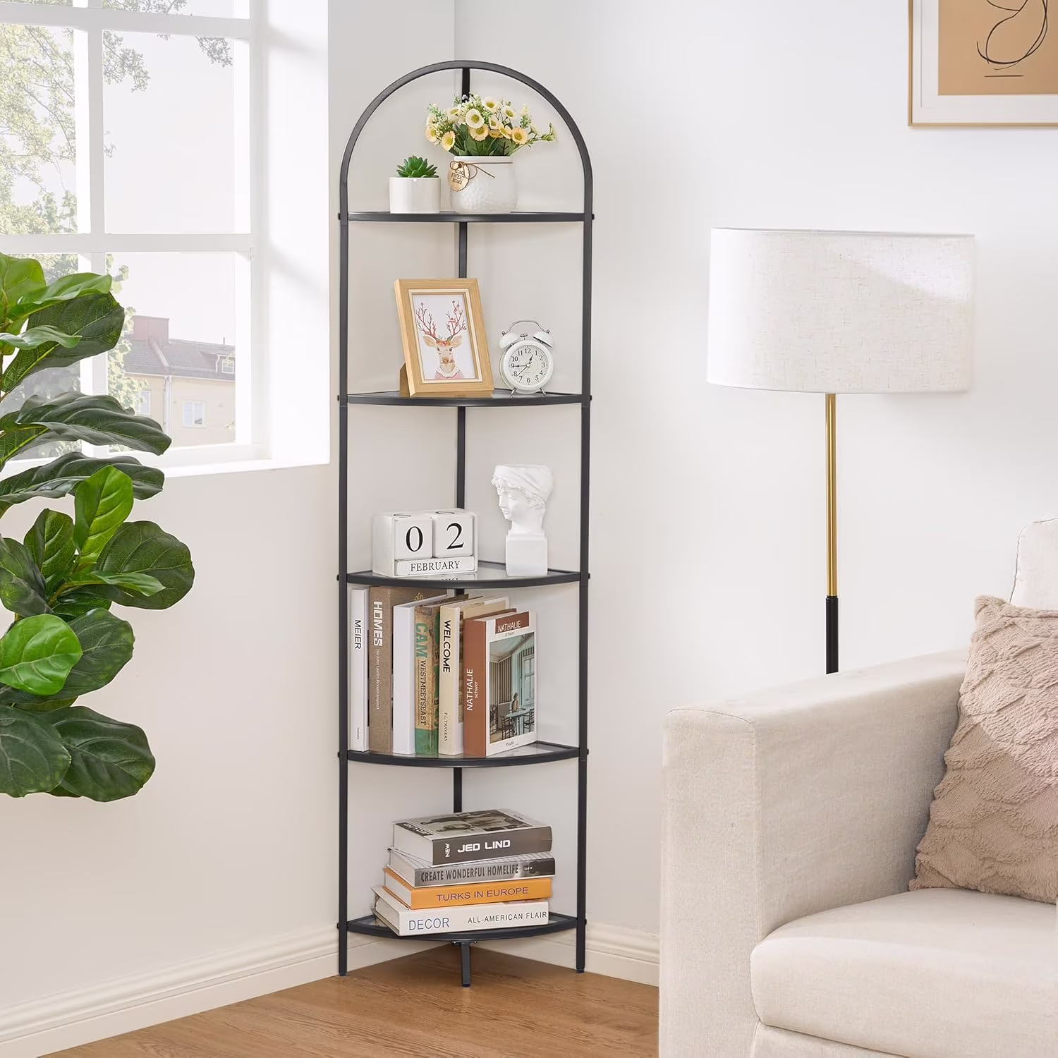 5-Tier Corner Shelf Stand, Metal Corner Bookshelf, Tempered Glass Shelves, Bathroom Storage Rack Shelf, Plant Stand, Modern Style, Black